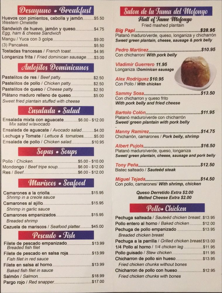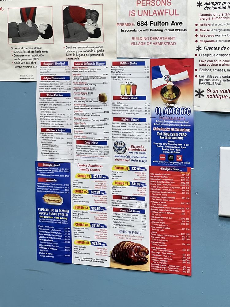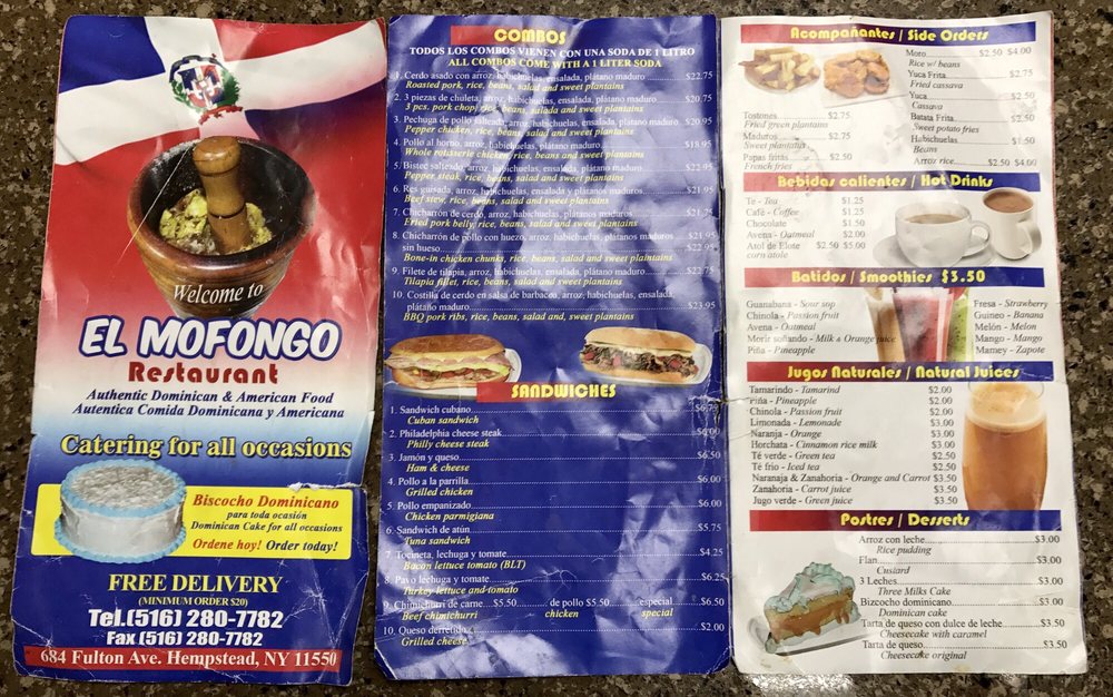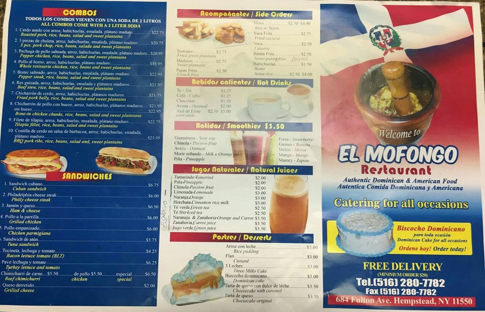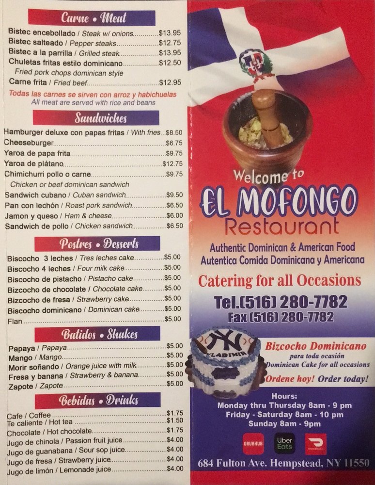 Introducing the menu at El Mofongo Restaurant, located in Hempstead, NY, brings a taste of authentic Dominican cuisine to your table. With options like pernil, chicken, plantains, and mofongo, each dish is made with care and attention to detail. The shrimp mofongo is a must-try, perfectly cooked with a garlic sauce that will leave you craving more. The tender and juicy pernil, along with the flavorful beef stew, showcases the skill and quality of the ingredients used. Don't miss out on the legendary desserts, like the tres leches cake and flan, that complete your dining experience. The friendly staff and welcoming atmosphere make you feel at home, ensuring a memorable dining experience every visit. Your taste buds will thank you for indulging in the delicious offerings at El Mofongo Restaurant.
